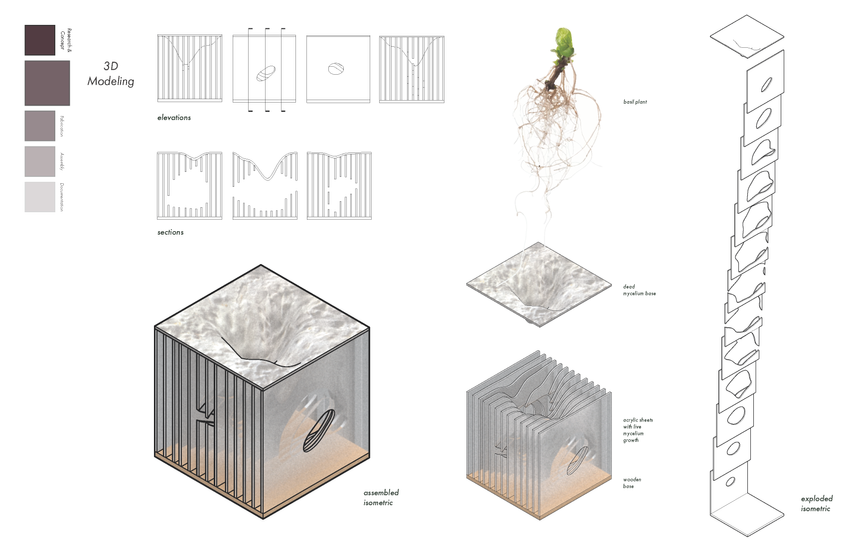 For this Mycelial vessel, we were interested in subverting the typical plant and planter relationship by using an emergent biomaterial that will continue to grow alongside the lifeform it supports. We considered in particular the unique versatility of Mycelium to grow into the frame it is placed in and the differences in resulting rigidity based on its state of life. Our final design incorporates both a baked Mycelium base to contain the plant, as well as a supporting structure of still inoculating Mycelium that operates within a separate ecosystem beneath the plant.